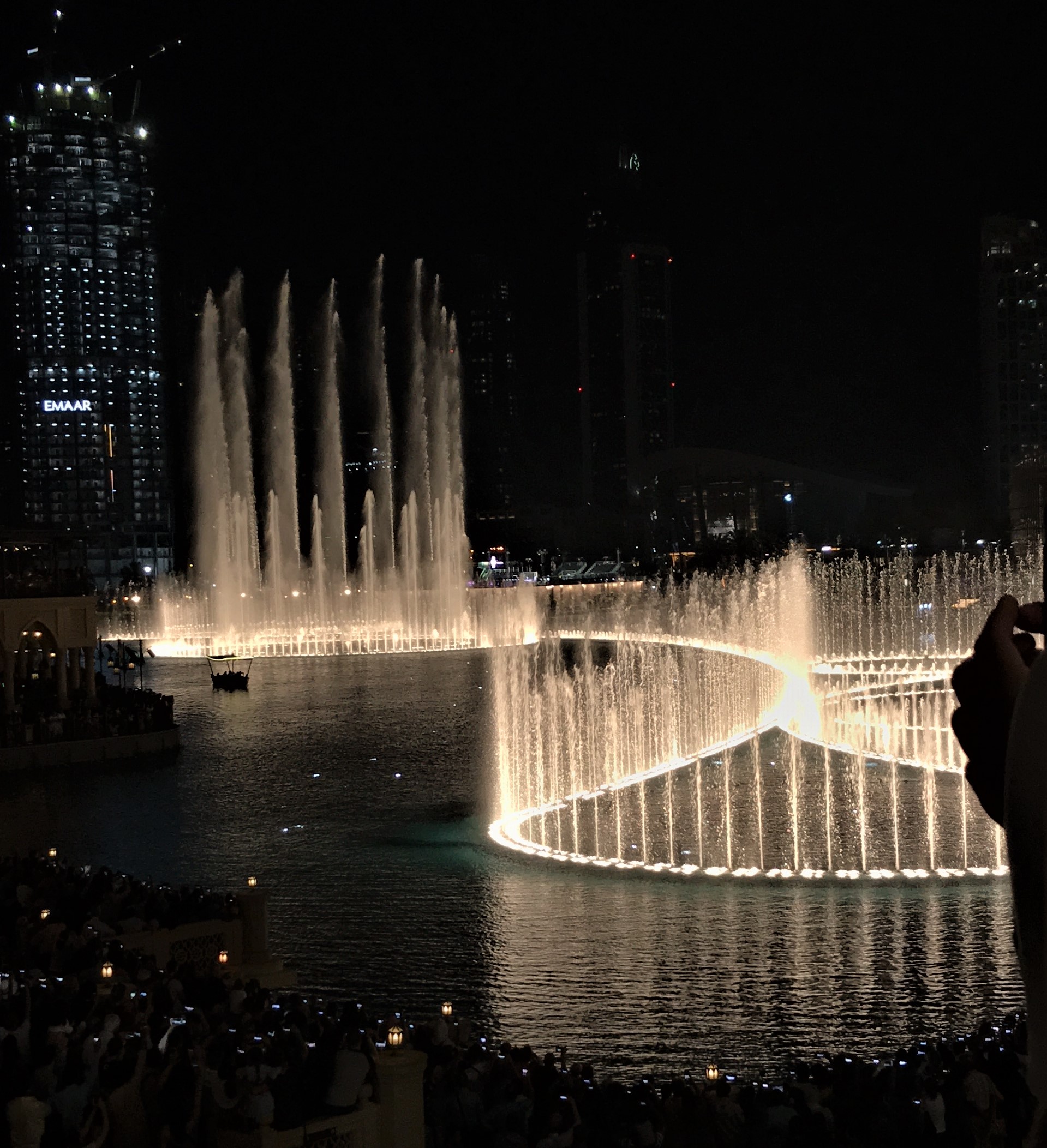 Fantanile de la baza turnului Burj Khalifa. Sunt absolut impresionante! Noi le-am vazut cand si-au inceput “dansul”, pe la apus, din Burj Khalifa, dupa care am coborat sa le vedem mai de aproape. Deja era puhoi de lume adunata in jurul fantanilor, asa ca am gasit o alta varianta. Am mers in mall, unde magazinul Apple (et1) are un balcon cu vederea exact spre fantani, daca aveti putin noroc, prindeti o vedere chiar mult mai buna decat daca priviti de la nivelul solului. Bineinteles puteti sa optati si pentru restaurantele de langa fantani, si sa luati cina in timp de admirati jocul de lumini.