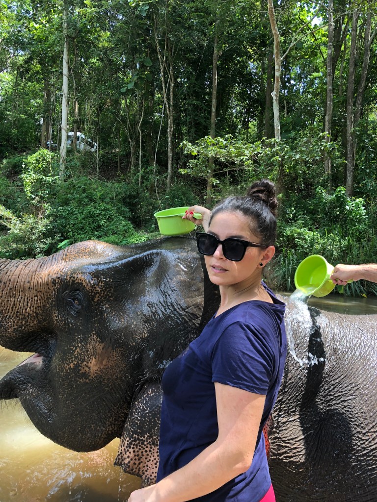 Excursia din a doua zi a fost, pentru mine, cea mai frumoasa din toata experienta Thailanda. La ora 7, minibusul a venit sa ne ia de la hotel. De cum am vazut-o pe ghida noastra, ne-am dat seama ca sa fie distractie! Prima oprire a fost intr-un sat traditional Kerren Village. Am vazut cum traiesc, cu ce se ocupa, ce mananca etc. O doamna, la vreo 98 de ani isi facea singura trabucul din foile de tutun culese chiar de la ea din gradina. Vindea niste coliere facute de ea din lemn de bambus. Am cumparat, de dragul ei! De aici am mers pe jos pe dealurile din apropiere, sau mai bine zis, un fel de jungla pana la o rezervatie mica, de elefanti. Si n-am mers mult, caci in cale ne-au iesit cativa localnici cu elefantii la pascut. Ghida, Eeat pe numele ei, ne-a spuns ca vom vedea un pui de elefant dragalas, ca il vom putea hrani etc. In realitate, elefantul de cand ne-a vazut ne-a fugarit! Avea chef de joaca, “mititelul”! Fiecare fugea unde apuca. Ba chiar a si impins o fata in boscheti, iar pe mine m-a ratat la milimetru! Atunci mi-am si rupt sandalele fugind prin noroaie!Gasiti clipul la instastory, pe @calatoreste_cu_emma.
