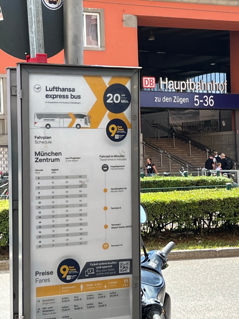 Autobuzul Lufthansa Express este chiar la iesirea din terminal, circula la fiecare 20 de minute si puteti sa va luati biletul online sau direct la sofer si costa 18 euro/dus-intors/persoana.